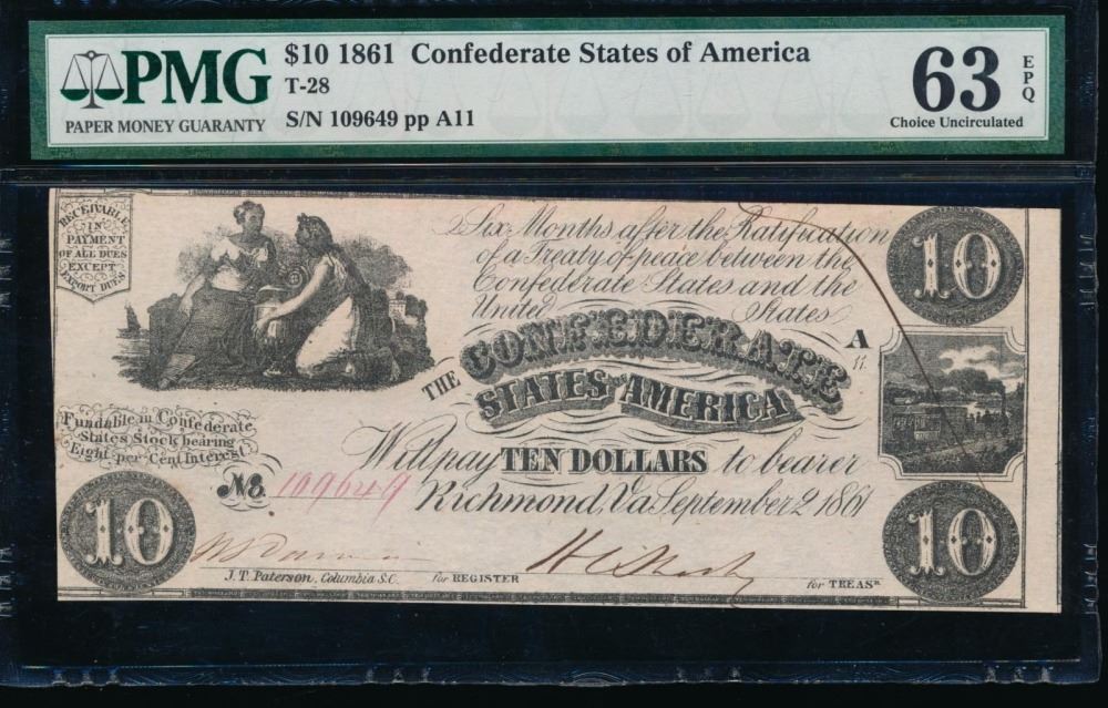 One 1861 $10 T-28 Confederate PMG 63EPQ.
