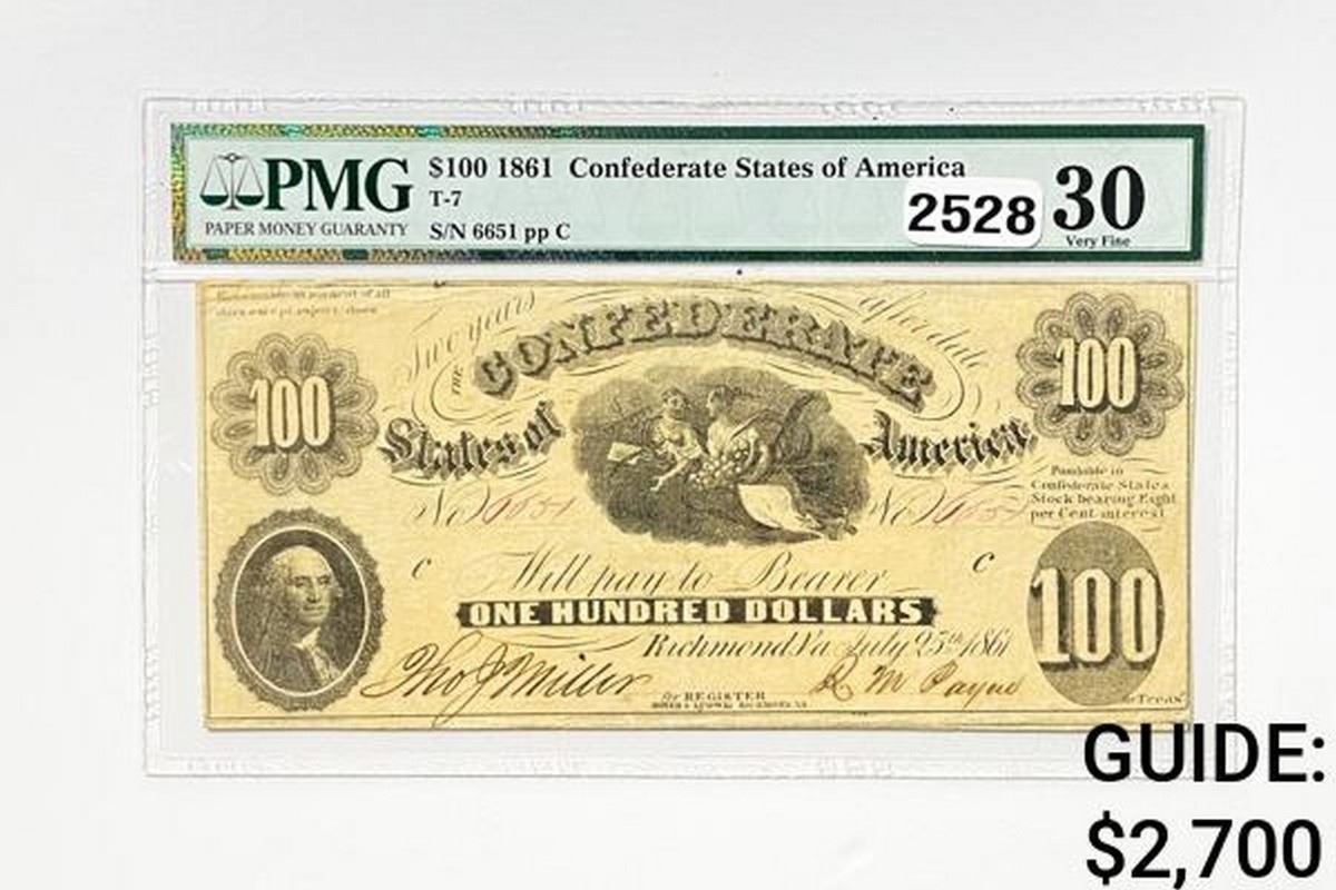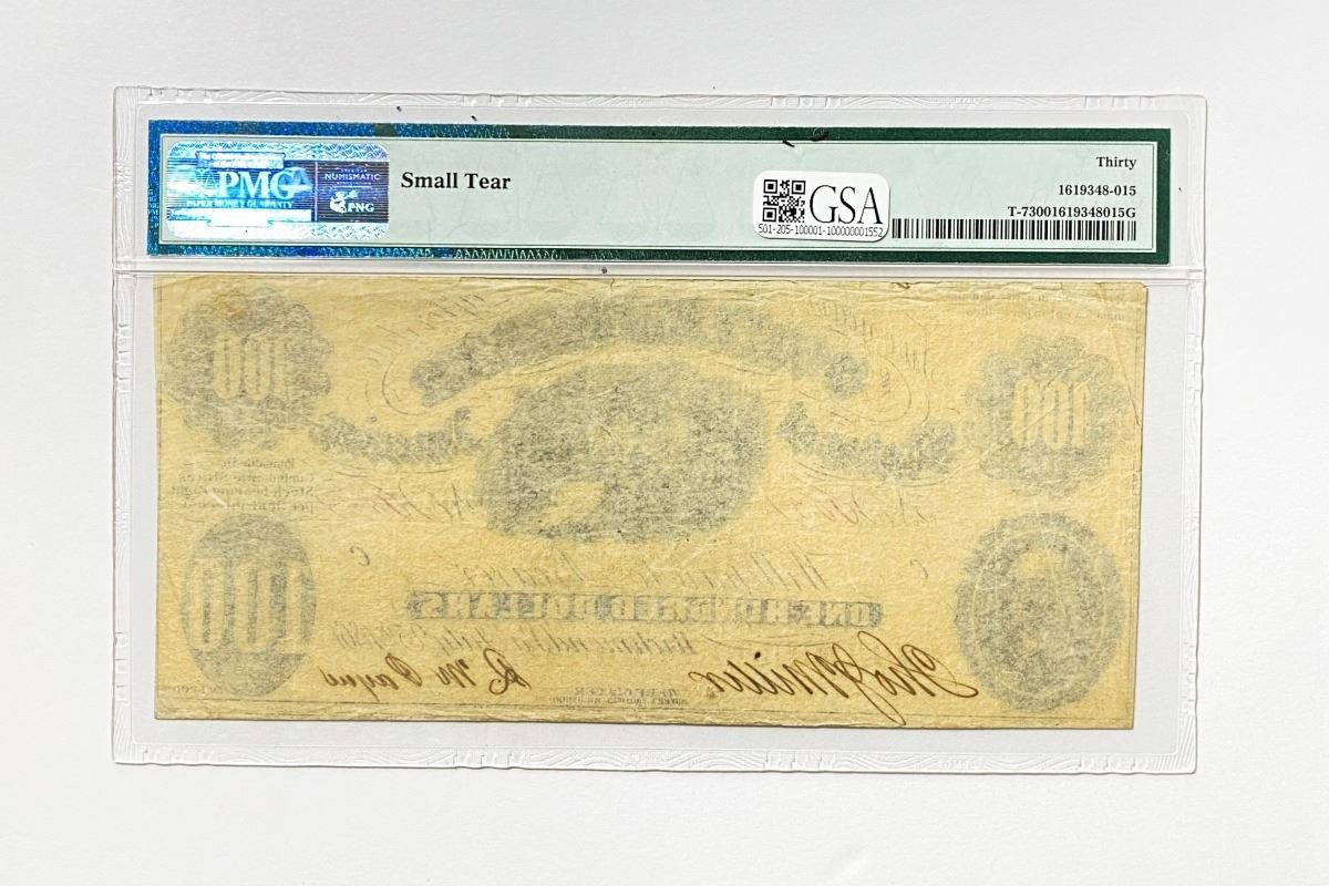 f. Notes sold referencing a third-party grading service are sold “AS IS” without any express or implied warranty, except for guarantee by GSA that they are genuine. Grading, condition or other attributes of any Product may have a material effect on its value and the opinion of others, including third-party grading services such as PCGS Currency and PMG may differ with that of GSA. GSA shall not be bound by any prior or subsequent opinion, determination, or certification by any grading service. Bidders specifically waive any claim to right of return of any Product because of the opinion, determination, or certification, or lack thereof, by any grading service. Certain warranties may be available from the grading services and Bidders are referred to them for further details: Paper Money Guaranty (PMG), PO Box 4711, Sarasota, FL 34230; PCGS Currency, PO Box 10470, Peoria, IL 61612-0470; PCGS Gold Shield, PO Box 9458, Newport Beach, CA 92658. Third-party graded notes are not returnable for any reason whatsoever.