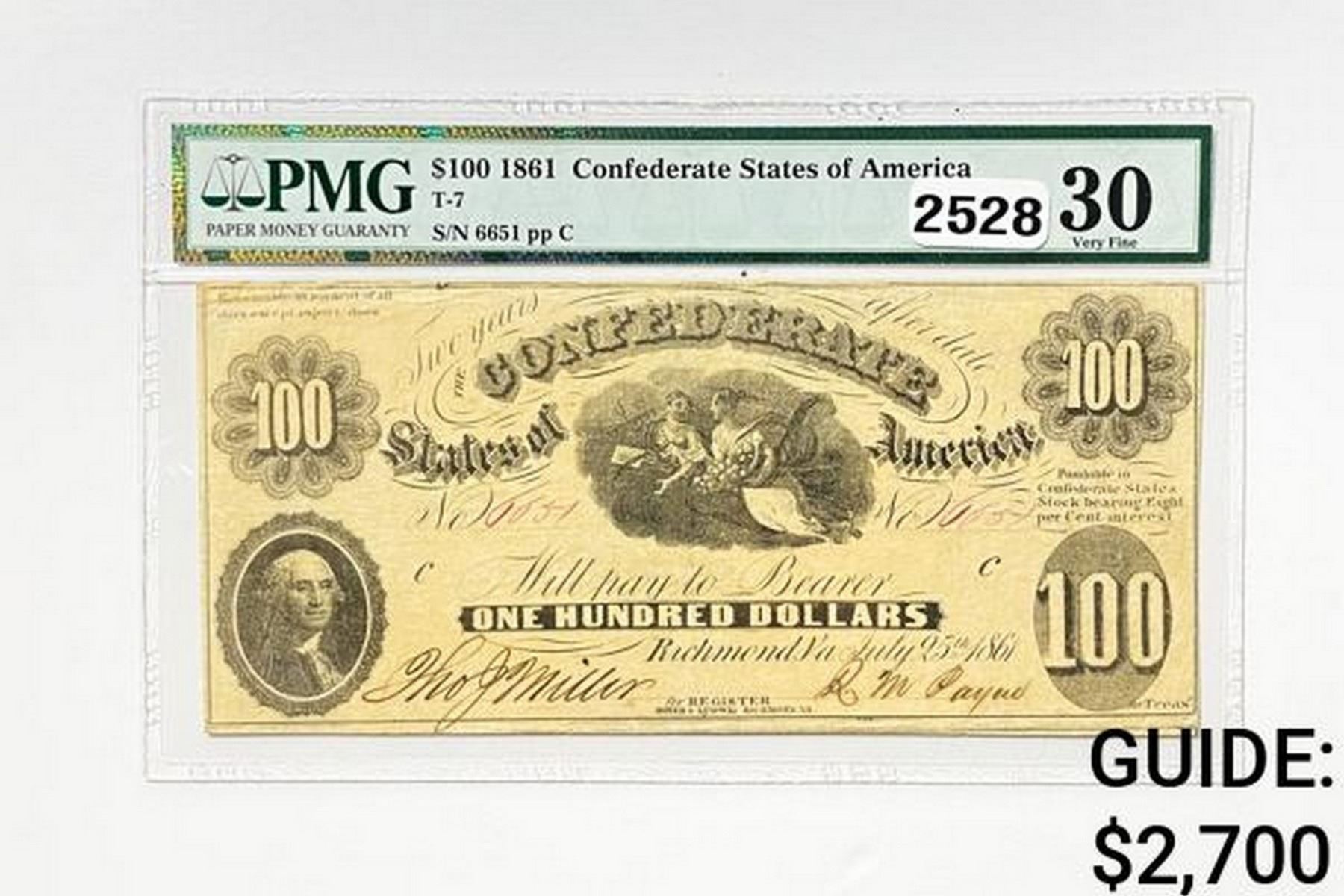 f. Notes sold referencing a third-party grading service are sold “AS IS” without any express or implied warranty, except for guarantee by GSA that they are genuine. Grading, condition or other attributes of any Product may have a material effect on its value and the opinion of others, including third-party grading services such as PCGS Currency and PMG may differ with that of GSA. GSA shall not be bound by any prior or subsequent opinion, determination, or certification by any grading service. Bidders specifically waive any claim to right of return of any Product because of the opinion, determination, or certification, or lack thereof, by any grading service. Certain warranties may be available from the grading services and Bidders are referred to them for further details: Paper Money Guaranty (PMG), PO Box 4711, Sarasota, FL 34230; PCGS Currency, PO Box 10470, Peoria, IL 61612-0470; PCGS Gold Shield, PO Box 9458, Newport Beach, CA 92658. Third-party graded notes are not returnable for any reason whatsoever.