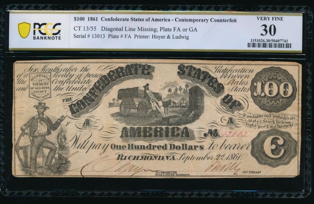 One 1861 $100 Confederate Counterfeit PCGS 30.