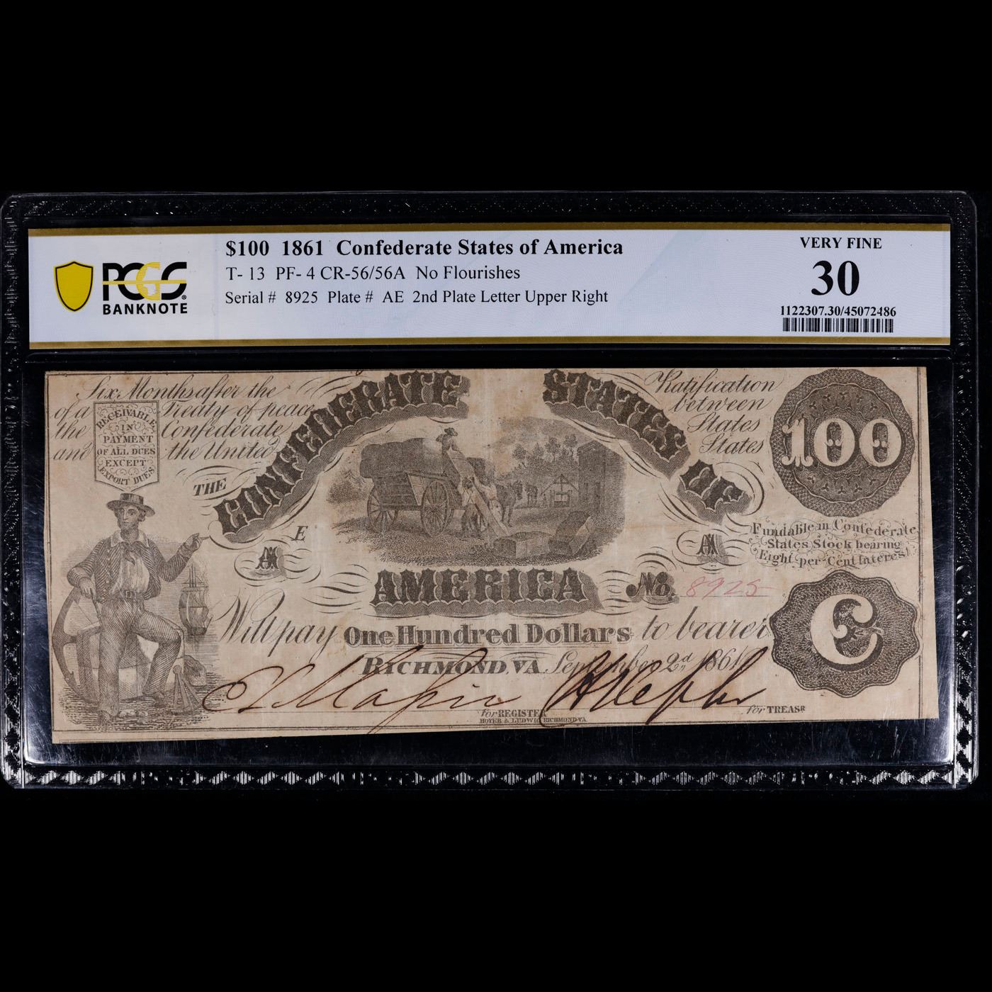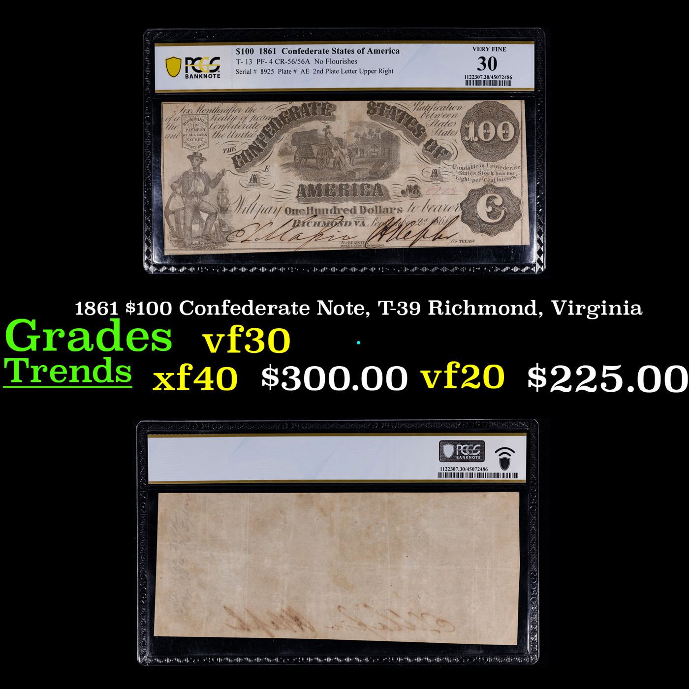 1861 $100 Confederate Note, T-39 Richmond, Virginia Graded vf30 BY PCGS.