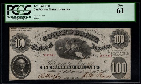One 1861 $100 Confederate States of America Note PCGS 61.