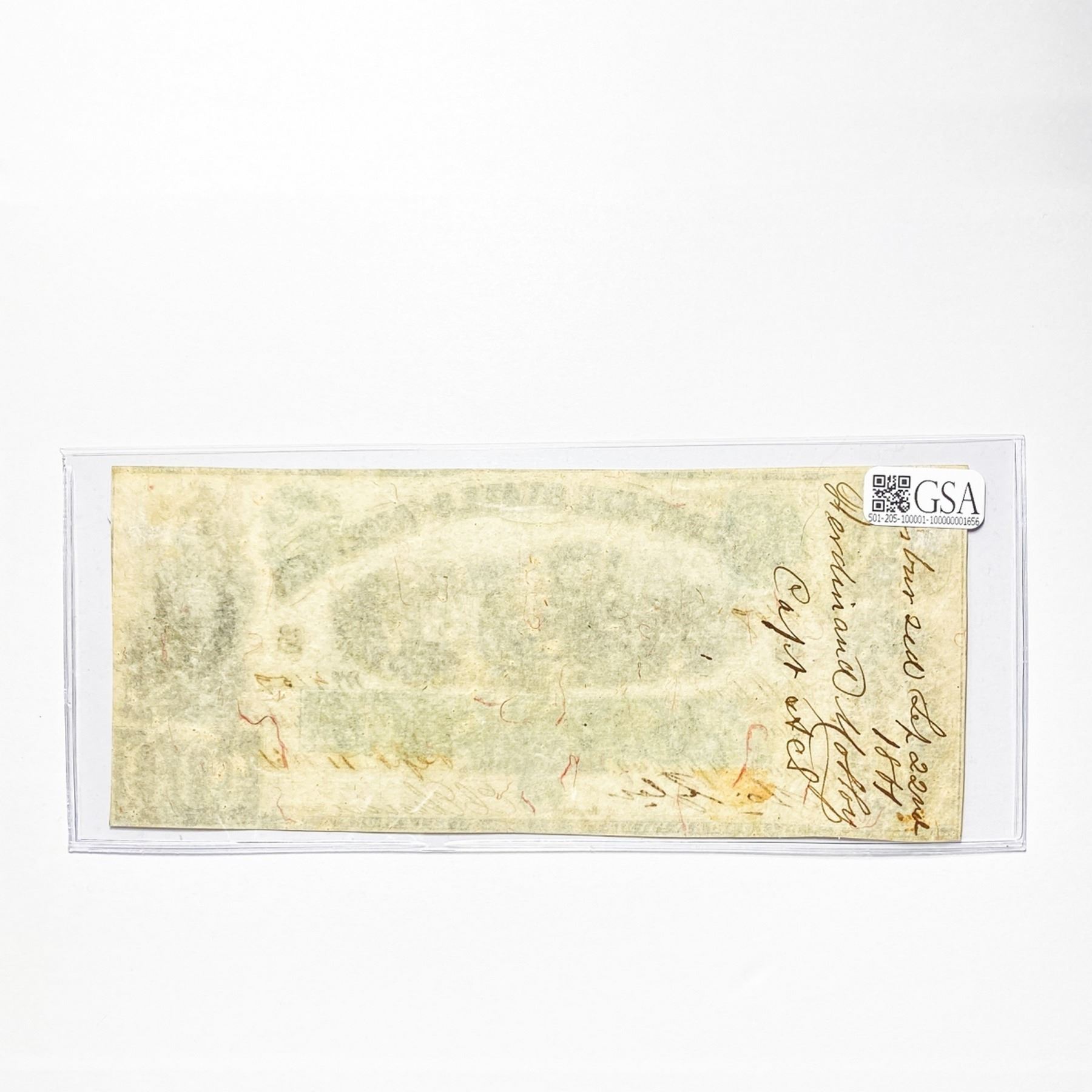 f. Notes sold referencing a third-party grading service are sold “AS IS” without any express or implied warranty, except for guarantee by GSA that they are genuine. Grading, condition or other attributes of any Product may have a material effect on its value and the opinion of others, including third-party grading services such as PCGS Currency and PMG may differ with that of GSA. GSA shall not be bound by any prior or subsequent opinion, determination, or certification by any grading service. Bidders specifically waive any claim to right of return of any Product because of the opinion, determination, or certification, or lack thereof, by any grading service. Certain warranties may be available from the grading services and Bidders are referred to them for further details: Paper Money Guaranty (PMG), PO Box 4711, Sarasota, FL 34230; PCGS Currency, PO Box 10470, Peoria, IL 61612-0470; PCGS Gold Shield, PO Box 9458, Newport Beach, CA 92658. Third-party graded notes are not returnable for any reason whatsoever.