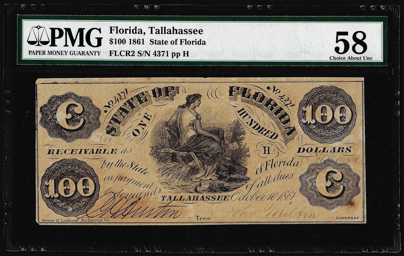 1861 $100 State of Florida Tallahassee Cr.2 Obsolete Note PMG Choice About Unc. 58