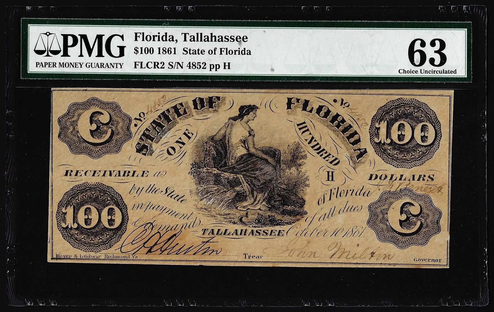 One 1861 $100 State of Florida Tallahassee Cr.2 Obsolete Note PMG Choice Uncirculated 63. PMG Certified.