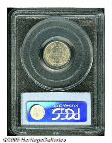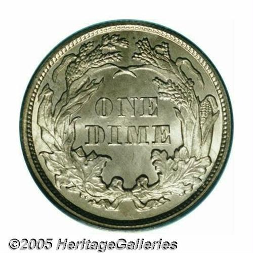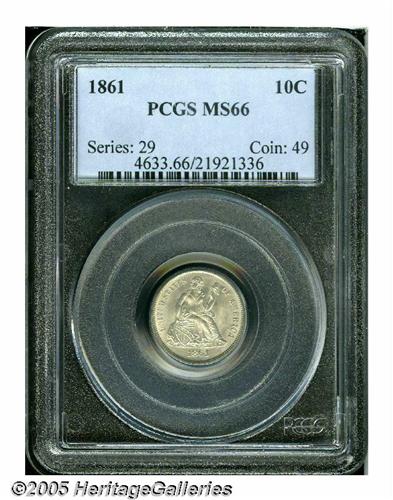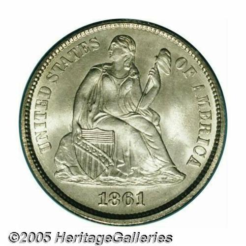 <B>1861<10C> MS66 PCGS.</B></I> This Civil War issue has bright, lustrous silver-gray surfaces that exhibit sharply struck design elements, and are impeccably preserved. Just a few minor marks occur on Liberty's left breast. This piece generates considerable overall eye appeal. As of March 2005, PCGS and NGC combined have certified just 14 examples, and one finer. Population: 4 in 66, 0 finer (3/05).