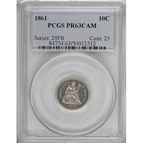 <B>1861 10C PR63 Cameo PCGS.</B></I> Light golden-brown and cobalt-blue endow the margins. No hairlines appear beneath a loupe. Much scarcer than implied by its reported mintage of 1,000 pieces, since unsold specimens were melted. Examples with significant cameo contrast, such as the present example, are very rare. Population: 2 in 63 Cameo, 0 finer (11/07).<BR><BR><b>Shipping:</b> Coins & Currency (<a target="_blank" href="http://www.heritageauctions.com/common/shipping.php">view shipping information</a>)