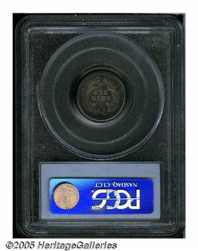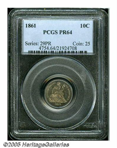 <B>1861<10C> PR64 PCGS.</B></I> Moderately toned with deeply reflective proof fields and mottled blue and russet shades. Scarcer than the mintage would indicate as many proofs were melted as unsold at year's end.