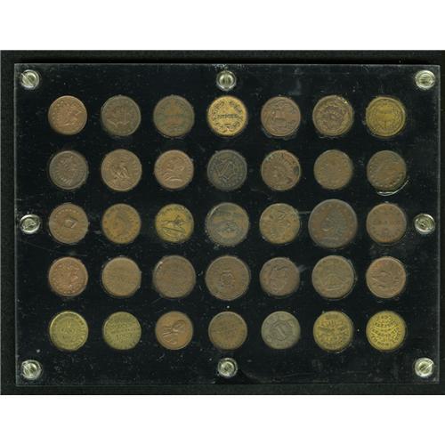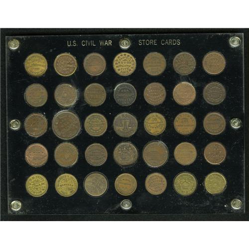 <B>(1861-1865) U.S. Civil War Merchants Storecard Group Lot of 35 Tokens.</B></I> A super group. Some tokens have remaining original mint luster. Most range from R.2 to R.4. Housed in a black hard plastic holder with a space for each token. Viewing is recommended. Current market value is about $350-$500.