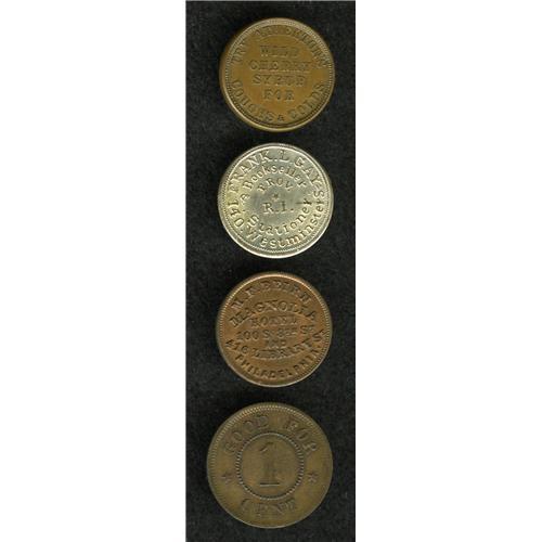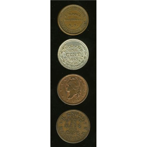 <B>(1861-1865) U.S. Civil War Token Group of Four Storecards, Identified by Fuld Numbers.</B></I> Excellent lot of four tokens, all AU or Uncirculated. Viewing of this lot is a must.