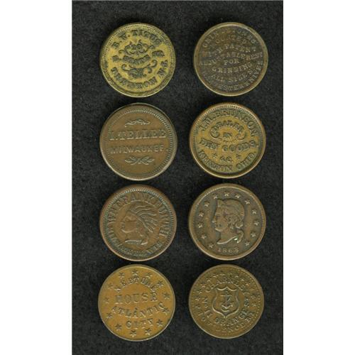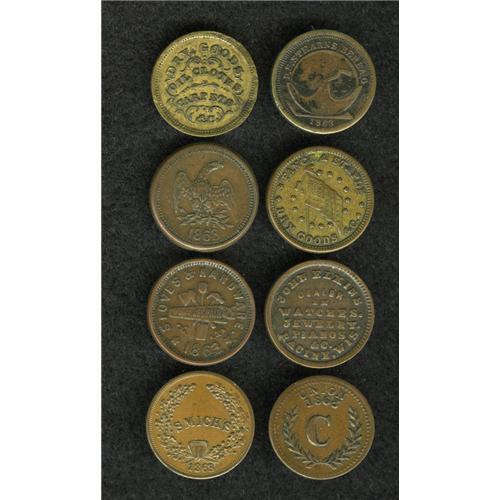 <B>(1861-1865) U.S. Civil War Group Lot of Eight Uncertified but Identified Storecards.</B></I> A great, must-view lot. Many of the tokens have a rarity factor above the normal R.2 and R.3 pieces, including an R.9.