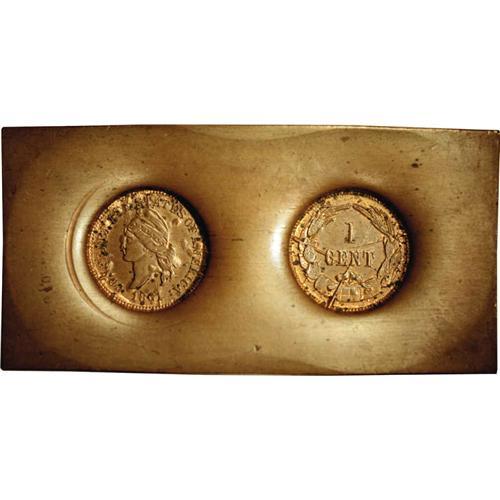 <B>1861<1C> Confederate States of America Obverse and Reverse Restrikes. Restruck by Robert Bashlow. Bronze.</B></I> Breen-8013. Obverse and reverse die impressions are set in a large bronze or copper block. Produced by August C. Frank, a Philadelphia medallist, whose imprint, name, and location are located on the back of the block. Undoubtedly a unique numismatic item.