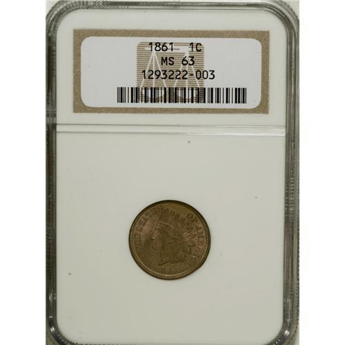 <B>1861 1C MS63 NGC.</B></I> NGC Census: (188/846). PCGS Population (176/518). Mintage: 10,100,000. Numismedia Wsl. Price for NGC/PCGS coin in MS63: $188. (#2061)<BR><BR><b>Shipping:</b> Coins & Currency (<a target="_blank" href="http://www.heritageauctions.com/common/shipping.php">view shipping information</a>)