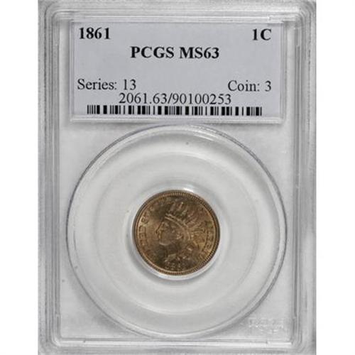 <B>1861 1C MS63 PCGS.</B></I> PCGS Population (176/512). NGC Census: (96/423). Mintage: 10,100,000. Numismedia Wsl. Price for NGC/PCGS coin in MS63: $188. (#2061)<BR><BR><B>Coin Engraver:</B> James B. Longacre<BR><BR><b>Shipping:</b> Coins & Currency (<a target="_blank" href="http://www.heritageauctions.com/common/shipping.php">view shipping information</a>)