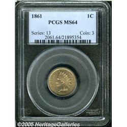 <B>1861 1C MS64 PCGS.</B></I> An intricately struck and fully lustrous Choice Copper-Nickel Cent, refreshingly unabraded and with attractive straw-gold and olive color. Traces of dirt near 7 o'clock do not appear to limit the grade.