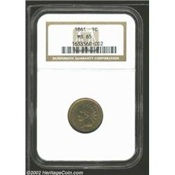 1861 1C MS65 NGC. Dusky rose, olive, and gold colors. A sharply struck Gem with good luster and near