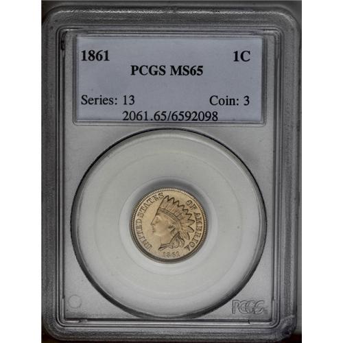<B>1861<1C> MS65 PCGS.</B></I> A highly lustrous example of an early Indian cent, this Gem is sharply struck and has no marks on the cheek, though a few small abrasions are noted in front of the nose.<BR><I>From The Chief Paduke Collection.</B></I>