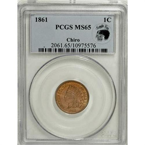 <B>1861 1C MS65 PCGS.</B></I> Ex: Chiro Collection. Eagle Eye Photo Seal, card not included. This is a lustrous piece with lovely chestnut-gold coloration and attractive reddish accents on the obverse. The design elements are quite sharp, with minimal weakness noted on the feather tips of Liberty's headdress. A couple of nicks on Liberty's cheek are insignificant. <BR><BR><BR><B>Coin Engraver:</B> James B. Longacre<BR><BR><b>Shipping:</b> Coins & Currency (<a target="_blank" href="http://www.heritageauctions.com/common/shipping.php">view shipping information</a>)
