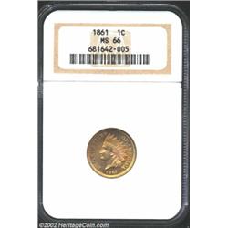 1861 1C MS66 NGC. Lemon and apricot colors encircle wisps of lilac patina. A bright, well struck, and lustrous Gem that has mildly reflective fields. Seemingly free from the most trivial contact, but with a few miniscule toning flecks. Population: 29 in 66, 2 finer (7/02). Important notice: We expect to be auctioning lots at the rate of 200-250 per hour. Sometimes eBay Premier live bid software cannot keep up with that pace, so we strongly recommend that you place a realistic proxy bid now as insurance to avoid disappointment. Also please note that all Heritage/CAA lots purchased through eBay Premier carry a 20% Buyer's Premium. Please make sure you read the Terms and Conditions.