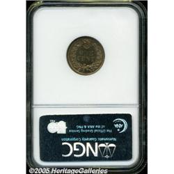 <B>1861 1C MS66 NGC.</B></I> Sharply struck with smooth satiny luster and pleasing, even reddish-tan coloration on both sides. A small cut in the upper right obverse field, almost at the rim, is the only surface distraction. Population: 34 in 66, 2 finer (2/05).
