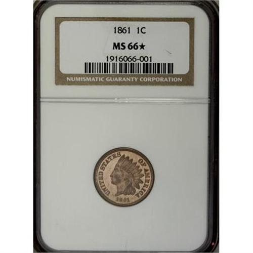 <B>1861 1C MS66 <img src="/images/star.gif" width="10" height="10" alt="" border="0"> NGC.</B></I> As of (3/08), the present Premium Gem is the only business strike 1861 cent to receive a Star designation from NGC. Just two pieces have been certified finer. Both sides are prooflike, and undoubtedly, this feature was the reason it secured a Star. Flashy and exactingly struck with an unblemished straw-gold appearance. 1861 was the lowest mintage issue of the copper-nickel subset of the series.<BR><BR><B>Coin Engraver:</B> James B. Longacre<BR><BR><b>Shipping:</b> Coins & Currency (<a target="_blank" href="http://www.heritageauctions.com/common/shipping.php">view shipping information</a>)