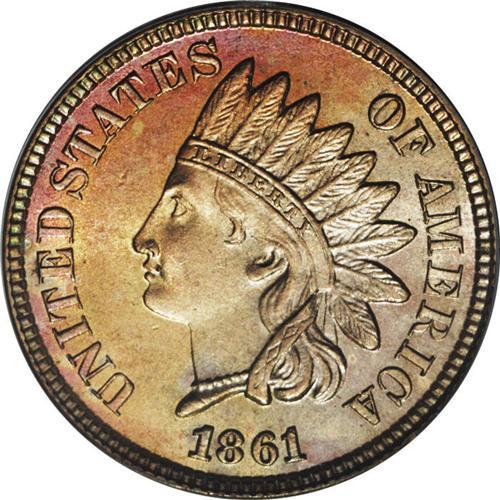 <B>1861 1C MS66 PCGS.</B></I> This Premium Gem, while not the finest example of the date certified by PCGS, ranks among the best that are available. Both sides are sharply detailed with frosty tan luster. The obverse has a veritable rainbow of color along the left side, while the reverse is light tan throughout. Population: 45 in 66, 9 finer (11/06).<BR><BR><b>Shipping:</b> Coin/Currency (<a target="_blank" href="http://www.heritageauctions.com/common/shipping.php">view shipping information</a>)