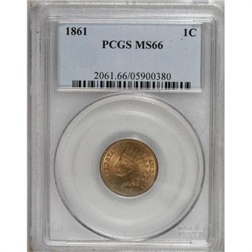 <B>1861 1C MS66 PCGS.</B></I> This Premium Gem copper-nickel cent has an attractive matte-like finish, with bright luster that illuminates the golden-tan surfaces. The design motifs are sharply rendered, including crisp definition on the upper feathertips of the headdress. Other than a couple of tiny nicks on the upper reverse, the surfaces of this highly attractive example are pristine. Population: 46 in 66, 10 finer (8/07). <BR><BR><B>Coin Engraver:</B> James B. Longacre<BR><BR><b>Shipping:</b> Coins & Currency (<a target="_blank" href="http://www.heritageauctions.com/common/shipping.php">view shipping information</a>)