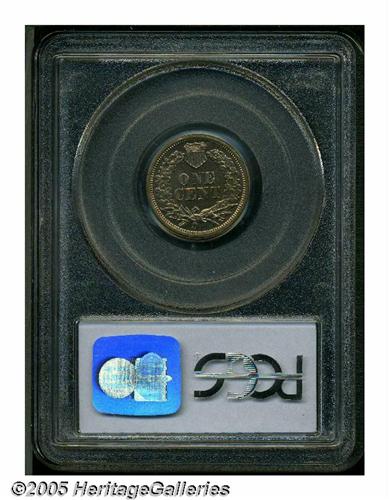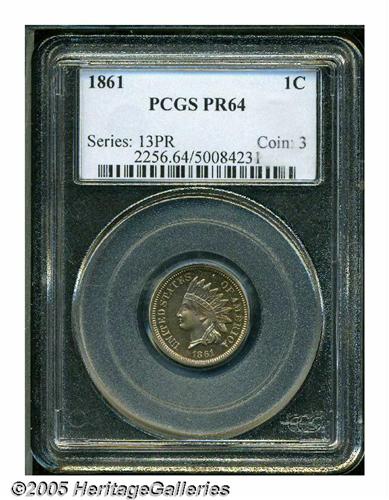 <B>1861<1C> PR64 PCGS.</B></I> The 1861 is in strong demand with collectors, especially in high grades, as the quality of the proofs struck this year was generally quite low. This is an especially deeply mirrored example that shows a light bit of (unrecognized) contrast between the fields and devices. The surfaces are lightly covered with lovely iridescent gray-rose and golden patina over the basic "white" surfaces inherent in the copper-nickel alloy. Population: 36 in 64, 19 finer (3/05).