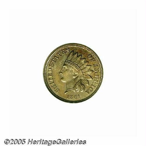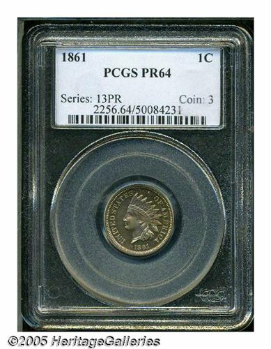 <B>1861<1C> PR64 PCGS.</B></I> The 1861 is in strong demand with collectors, especially in high grades, as the quality of the proofs struck this year was generally quite low. This is an especially deeply mirrored example that shows a light bit of (unrecognized) contrast between the fields and devices. The surfaces are lightly covered with lovely iridescent gray-rose and golden patina over the basic "white" surfaces inherent in the copper-nickel alloy. Population: 37 in 64, 19 finer (5/05).