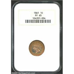 1861 1C PR65 NGC. Deeply mirrored and beautifully toned with hazy iridescence over each side and bright honey-orange colored fields. Very scarce with only 12 pieces having been so graded by NGC and three finer (11/02). Important notice: We expect to be auctioning lots at the rate of 200-250 per hour. Sometimes eBay Premier live bid software cannot keep up with that pace, so we strongly recommend that you place a realistic proxy bid now as insurance to avoid disappointment. Also please note that all Heritage/CAA lots purchased through eBay Premier carry a 20% Buyer's Premium. Please make sure you read the Terms and Conditions.