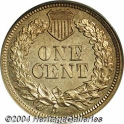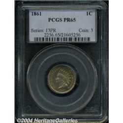 <B>1861<1C> PR65 PCGS.</B></I> Far above average for the issue. It is generally thought that proofs from this year were singly struck. Many are also shallowly mirrored. If that was the case with this coin, it was struck from freshly polished dies as the mirrors in the fields show good reflectivity. Also, the striking definition is complete in all areas. Close examination reveals a few tiny specks of carbon on each side. Pleasing light reddish patina. Population: 20 in 65, 2 finer (7/04). <BR><BR><B>Important notice:</B> Heritage usually auctions material at the rate of 200-250 lots per hour. On some occasions eBay Live bid software or the Internet may not be able to keep up with the pace of the auction. We recommend placing a realistic absentee bid now as insurance to avoid disappointment. Occasionally the auctioneer may eliminate or reject an eBay Live bid, and the auctioneer may also reopen a lot after the close of the eBay live bidding (usually because we missed an audience bid), and may reject your bid even if it shows you as the winning bidder. By bidding via eBay Live, you agree that Heritage may award the lot to another bidder at its sole discretion under the circumstances described above or any other reasonable circumstances. Since eBay bids are not shown to us until we open the lot on the floor, we treat those bids just like floor bids. In most cases the floor responds before the eBay bid is presented to us, due to Internet lag time, so for consistency we have made it a policy that floor bids are always considered first over tie eBay live bids. Also please note that all Heritage lots purchased through eBay Live carry a 20% Buyer's Premium. Please make sure you read the Terms and Conditions before you bid. </span></font></tr></table></td></tr></table>