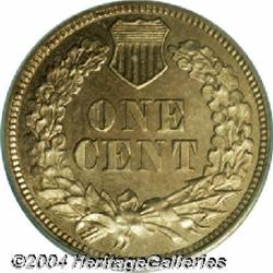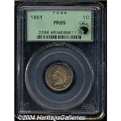 <B>1861<1C> PR65 PCGS.</B></I> Eagle Eye Photo Seal, card not included. This meticulously struck green label Gem has luminous peach fields and light chestnut color on the devices. An outstanding example of the Copper-Nickel type, which is available as a business strike but very elusive in proof format. Struck from moderately rotated dies. Population: 20 in 65, 2 finer (9/04). <BR><BR><B>Important notice:</B> Heritage usually auctions material at the rate of 200-250 lots per hour. On some occasions eBay Live bid software or the Internet may not be able to keep up with the pace of the auction. We recommend placing a realistic absentee bid now as insurance to avoid disappointment. Occasionally the auctioneer may eliminate or reject an eBay Live bid, and the auctioneer may also reopen a lot after the close of the eBay live bidding (usually because we missed an audience bid), and may reject your bid even if it shows you as the winning bidder. By bidding via eBay Live, you agree that Heritage may award the lot to another bidder at its sole discretion under the circumstances described above or any other reasonable circumstances. Since eBay bids are not shown to us until we open the lot on the floor, we treat those bids just like floor bids. In most cases the floor responds before the eBay bid is presented to us, due to Internet lag time, so for consistency we have made it a policy that floor bids are always considered first over tie eBay live bids. Also please note that all Heritage lots purchased through eBay Live carry a 20% Buyer's Premium. Please make sure you read the Terms and Conditions before you bid.