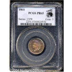 <B>1861<1C> PR65 PCGS.</B></I> Eagle Eye Photo Seal. Sharply struck with outstanding eye appeal. This lovely Gem Proof has pale orange and pinkish coloration, highly unusual among the copper-nickel cents. A couple dark toning spots are visible when closely inspected. The reverse die is rotated slightly counterclockwise. Population: 20 in 65, 2 finer (9/04). <BR><BR><B>Important notice:</B> Heritage usually auctions material at the rate of 200-250 lots per hour. On some occasions eBay Live bid software or the Internet may not be able to keep up with the pace of the auction. We recommend placing a realistic absentee bid now as insurance to avoid disappointment. Occasionally the auctioneer may eliminate or reject an eBay Live bid, and the auctioneer may also reopen a lot after the close of the eBay live bidding (usually because we missed an audience bid), and may reject your bid even if it shows you as the winning bidder. By bidding via eBay Live, you agree that Heritage may award the lot to another bidder at its sole discretion under the circumstances described above or any other reasonable circumstances. Since eBay bids are not shown to us until we open the lot on the floor, we treat those bids just like floor bids. In most cases the floor responds before the eBay bid is presented to us, due to Internet lag time, so for consistency we have made it a policy that floor bids are always considered first over tie eBay live bids. Also please note that all Heritage lots purchased through eBay Live carry a 20% Buyer's Premium. Please make sure you read the Terms and Conditions before you bid.
