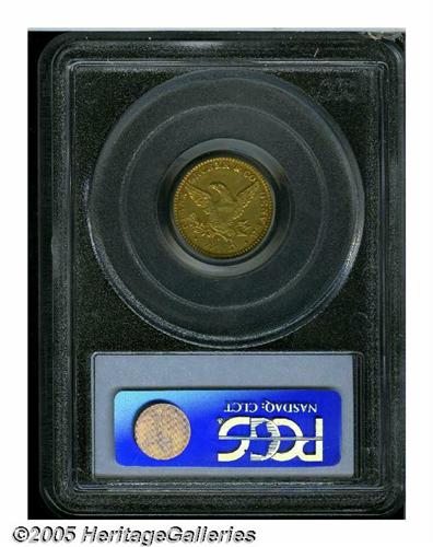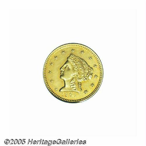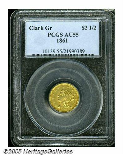 <B>1861<$2 1/2> Clark, Gruber & Co. Quarter Eagle AU55 PCGS.</B></I> K-5a, R.4. It is likely that only one obverse die was used to strike 1861 Clark, Gruber Quarter Eagles. Although star 7 is recut, which would make this piece technically Kagin-5a rather than K-5, it is likely that all survivors above a certain circulated grade will exhibit this feature. Lovely orange-gold and olive in color, the central strike is good for the mint, albeit not needle-sharp. A couple of subdued handling marks on the reverse field do not distract. Listed on page 309 of the 2005 <I>Guide Book.</B></I><BR><I>From The Great Western Collection of Territorial Gold.</B></I>