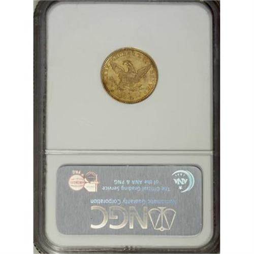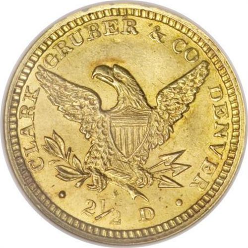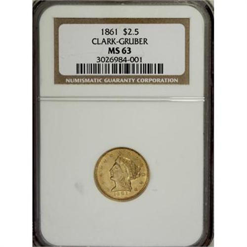 <B>1861 $2 1/2 Clark, Gruber & Co. Quarter Eagle MS63 NGC.</B></I> After gold was discovered in Colorado, in the late 1850s, three partners (two of them brothers) started a banking and coining business called Clark, Gruber and Company. In 1860, the company put up a two-story brick building in the new city of Denver (then called Denver City), a fine <BR>brick and mortar building in a town where most of the homes were made of logs or canvas with dirt floors. The company's first coins were minted on July 4, 1860, and their minting operation continued on a <BR>twenty-four hour per day basis over the next two years, producing quarter eagles, half eagles, eagles, and double eagles.<BR> The current offering is a conditionally scarce representative of the 1861 Clark & Gruber quarter eagle. It is well struck with nice luster, attractive green-gold coloration, and just a handful of trivial <BR>marks on each side. NGC has graded a mere three examples of this important territorial issue at MS63 and only one finer (at MS64), as of March 2008.<BR><BR><b>Shipping:</b> Coins & Currency (<a target="_blank" href="http://www.heritageauctions.com/common/shipping.php">view shipping information</a>)