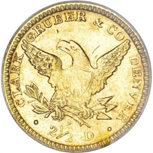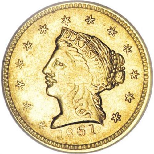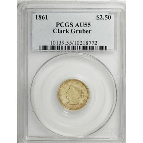 <B>1861 $2 1/2 Clark, Gruber & Co. Quarter Eagle AU55 PCGS.</B></I> K-5a, R.7 per Kagin (1981), although it is likely not quite that rare today. Clark, Gruber & Company issued quarter eagles in 1860 and 1861, and both issues seem to be equally available to collectors. The current example displays typical strike weakness at the centers and a few scattered abrasions on both sides. However, any minor problems are easily redeemed by this coin's splendidly original surfaces and eye appeal. Listed on page 367 of the 2008 <I>Guide Book. </B></I>Population: 14 in 55, 14 finer (1/08).<BR><BR><b>Shipping:</b> Coins & Currency (<a target="_blank" href="http://www.heritageauctions.com/common/shipping.php">view shipping information</a>)
