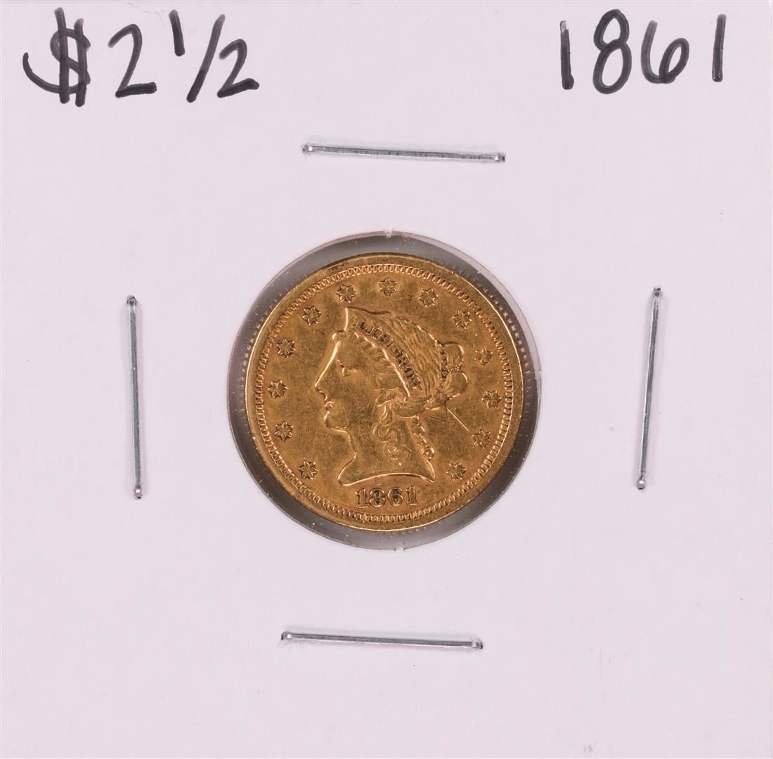 One 1861 $2 1/2 Liberty Head Quarter Eagle Gold Coin.