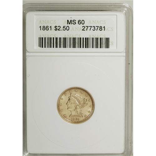 <B>1861 $2 1/2 New Reverse, Type Two MS60 ANACS.</B></I> NGC Census: (33/720). PCGS Population (23/416). Mintage: 1,283,878. Numismedia Wsl. Price for NGC/PCGS coin in MS60: $308. (#7794)<BR><BR><b>Shipping:</b> Coins & Currency (<a target="_blank" href="http://www.heritageauctions.com/common/shipping.php">view shipping information</a>)