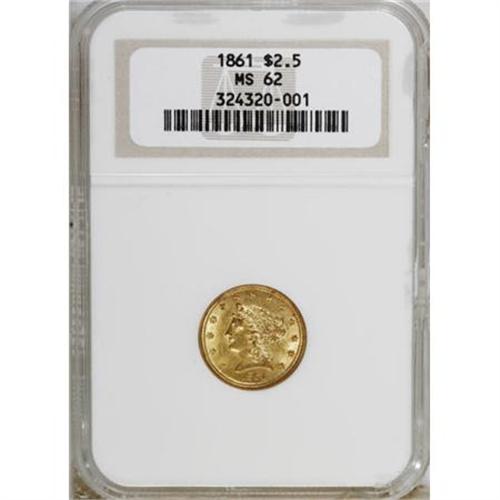 <B>1861 $2 1/2 New Reverse, Type Two MS62 NGC.</B></I> NGC Census: (276/221). PCGS Population (143/207). Mintage: 1,283,878. Numismedia Wsl. Price for NGC/PCGS coin in MS62: $500. (#7794)<BR><BR><B>Coin Engraver:</B> Christian Gobrecht<BR><BR><b>Shipping:</b> Coins & Currency (<a target="_blank" href="http://www.heritageauctions.com/common/shipping.php">view shipping information</a>)