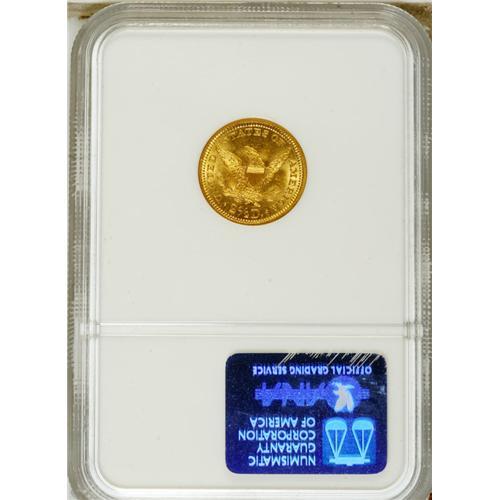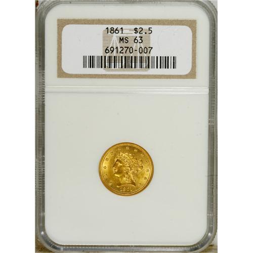 <B>1861 $2 1/2 New Reverse, Type Two MS63 NGC.</B></I> A highly lustrous canary-gold representative of this later variety, the more common of the two for this issue. Select with pleasing detail and small, scattered abrasions.<BR><BR><b>Shipping:</b> Coins & Currency (<a target="_blank" href="http://www.heritageauctions.com/common/shipping.php">view shipping information</a>)