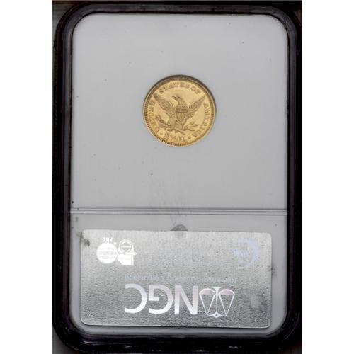 <B>1861<$2 1/2> New Reverse, Type Two MS63 NGC.</B></I> This beautiful light peach-gold Civil War quarter eagle would surely achieve a higher grade were it not for a small mark on the chin. Nonetheless, this smooth, well struck piece has superior eye appeal for the MS63 level.