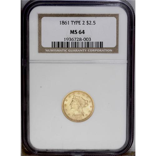 1861 $2 1/2 New Reverse, Type Two MS64 NGC. This examp