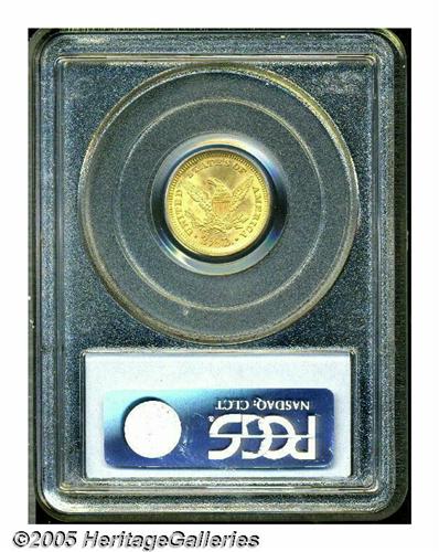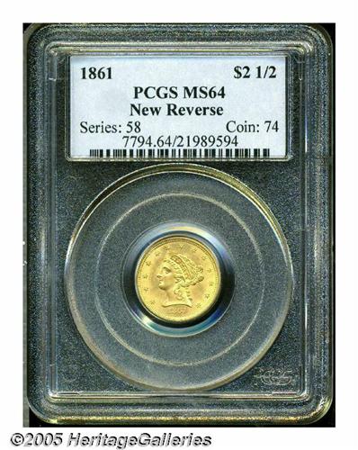 <B>1861<$2 1/2> New Reverse, Type Two MS64 PCGS.</B></I> Glowing luster lies beneath greenish-gold patina, and all of the design features are well brought up. A couple of minor scuffs are noted in the left (facing) obverse field. This date is quite common in all grades, and is actually considered the single common date issue prior the 1890s. In fact, this is one of just four Liberty Quarter Eagles in the entire series with a mintage exceeding 1 million coins. Population: 54 in 64, 28 finer (6/05).