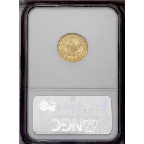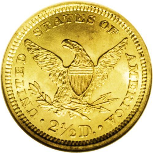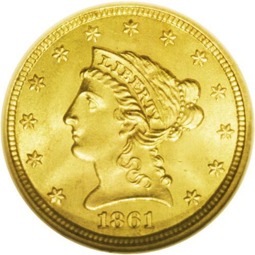 <B>1861<$2 1/2> New Reverse, Type Two MS66 NGC.</B></I> A precisely struck representative of this popular Civil War issue. Luster shimmers across the unmarked green-gold fields and devices. More quarter eagles were struck at Philadelphia in 1861 than for all other years of the decade combined, including the branch mint issues. But few 1861 examples can compete with the immense quality of the present piece. Census: 4 in 66, 0 finer (9/06).
