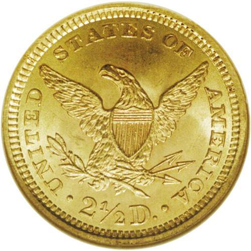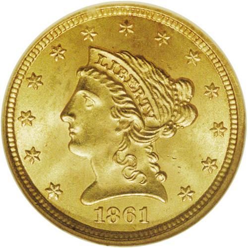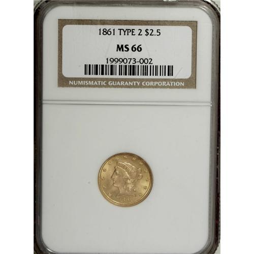 <B>1861 $2 1/2 New Reverse, Type Two MS66 NGC.</B></I> A precisely struck representative of this popular Civil War issue. Luster shimmers across the unmarked green-gold fields and devices. More quarter eagles were struck at Philadelphia in 1861 than for all other years of the decade combined, including the branch mint issues; but few 1861 examples can compete with the immense quality of the present piece. Census: 4 in 66, 0 finer (12/06).<BR><BR><b>Shipping:</b> Coin/Currency (<a target="_blank" href="http://www.heritageauctions.com/common/shipping.php">view shipping information</a>)