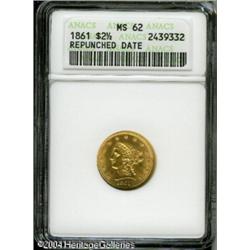 1861 $2 1/2 New Reverse, Type Two--Repunched Date--M <B>1861 $2 1/2 New Reverse, Type Two--Repunched Date--MS62 ANACS.</B></I> Breen-6258, "Very rare." The 18 in the date is nicely repunched south. This exquisitely struck representative features booming luster and impressive surfaces for the conservatively assigned grade. <BR><BR><B>Important notice:</B> Heritage usually auctions material at the rate of 200-250 lots per hour. On some occasions eBay Live bid software or the Internet may not be able to keep up with the pace of the auction. We recommend placing a realistic absentee bid now as insurance to avoid disappointment. Occasionally the auctioneer may eliminate or reject an eBay Live bid, and the auctioneer may also reopen a lot after the close of the eBay live bidding (usually because we missed an audience bid), and may reject your bid even if it shows you as the winning bidder. By bidding via eBay Live, you agree that Heritage may award the lot to another bidder at its sole discretion under the circumstances described above or any other reasonable circumstances. Since eBay bids are not shown to us until we open the lot on the floor, we treat those bids just like floor bids. In most cases the floor responds before the eBay bid is presented to us, due to Internet lag time, so for consistency we have made it a policy that floor bids are always considered first over tie eBay live bids. Also please note that all Heritage lots purchased through eBay Live carry a 20% Buyer's Premium. Please make sure you read the Terms and Conditions before you bid. This lot is being auctioned in conjunction with a live floor auction by Heritage Galleries & Auctioneers. All final auction and invoice information will be supplied by Heritage Galleries & Auctioneers, and all other information should be considered preliminary. Lot:6509