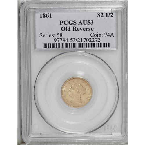 <B>1861<$2 1/2> Old Reverse, Type One AU53 PCGS.</B></I> A well struck yellow-orange piece with minor handling marks. Delicate luster is visible at the obverse periphery and covers more area on the reverse. Population: 2 in 53, 16 finer (9/06).