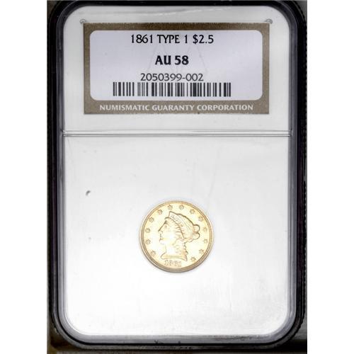 1861 $2 1/2 Old Reverse, Type One AU58 NGC. Beginning