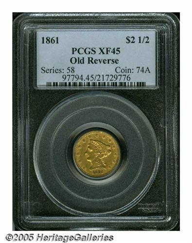 <B>1861<$2 1/2> Old Reverse, Type One XF45 PCGS.</B></I> A solid example of by far the rarer of the two 1861 varieties. The present example has sand-gold surfaces and only very faint light wispiness. Die clash is evident to the left of the eagle.