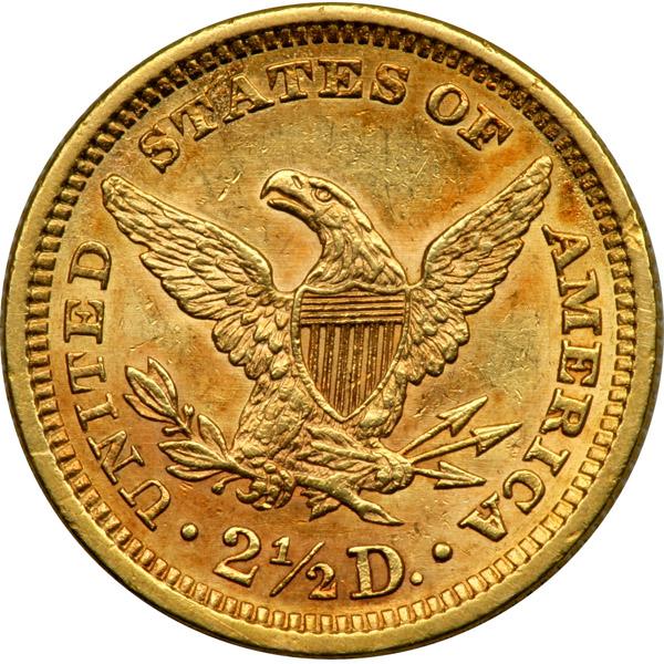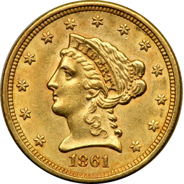 1861 $2.50 Liberty. MS-60. New Reverse. Nice gold toning.